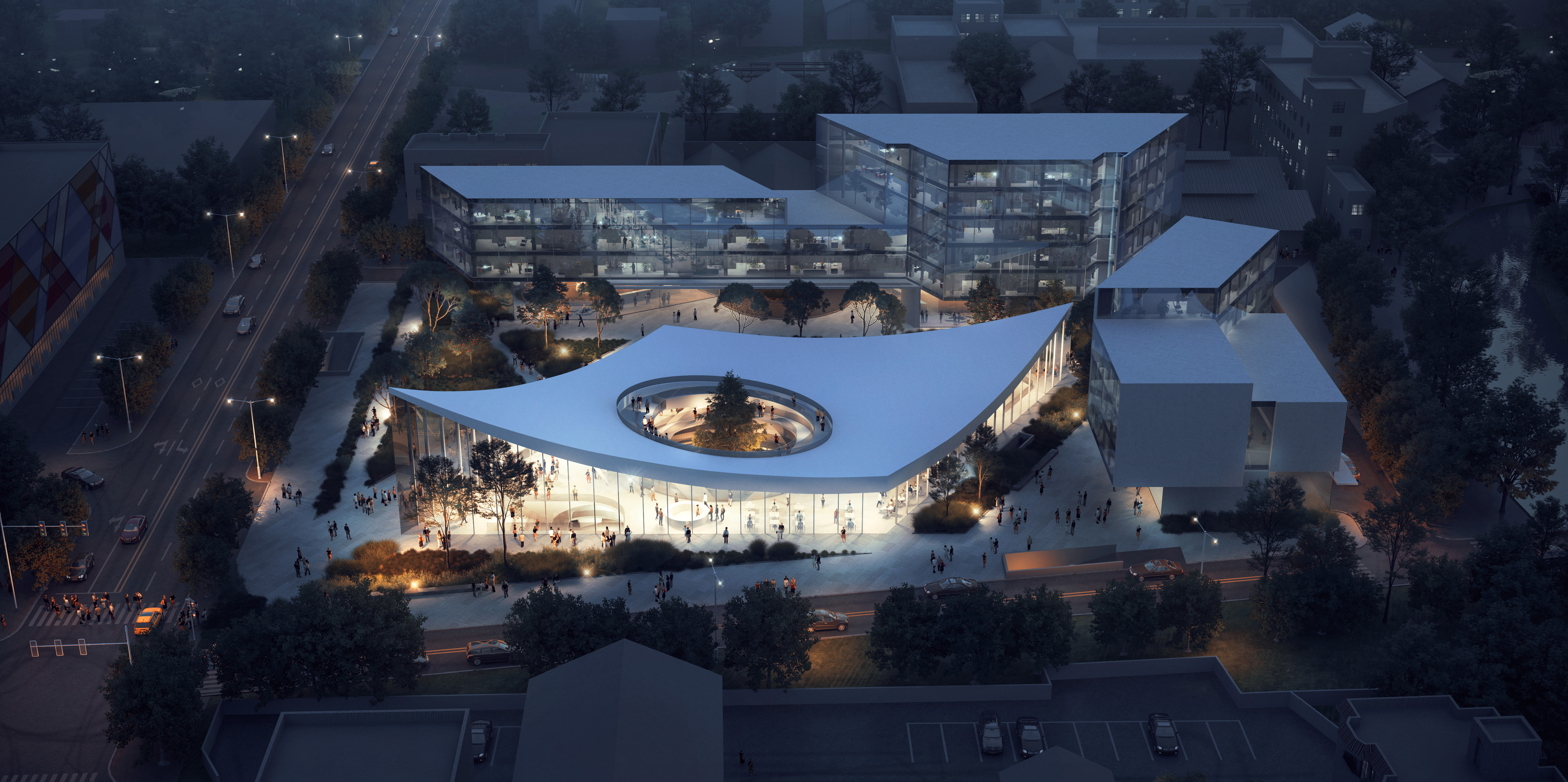 The project serves as the office complex for Goodbaby International, a manufacturer for children’s carts and associated products. The company’s park consists of offices, research spaces, and a musuem show room open to the public. Our proposal is inspiered by the abstract movement of a cradle. We took the shape of a gentle curvature, and amplified it by turning it into spactial organizations at a building scale. We hope the form will give the musuem a differnt spatial experience, and make the musuem more inviting and friendly to the local community.